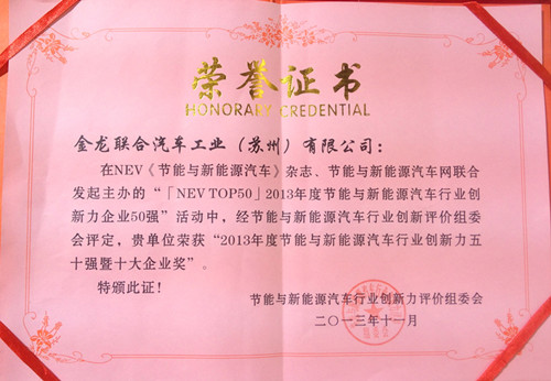 节能与新能源汽车产业十大年度最具影响力企业证书