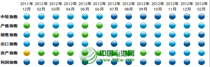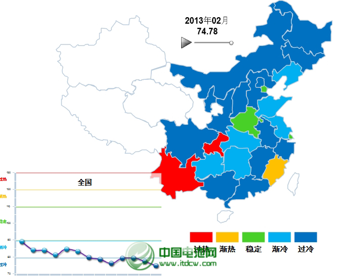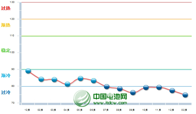 2013年3月19日,中国轻工业信息中心发布2013年2月中轻电池景气指数。2月份中轻电池景气指数为74.48,继续停留在“过冷”提示区。其中:产值景气指数89.27;销售景气指数78.92,首次进入“过冷”提示区;出口景气指数68.47;资产景气指数87.30;利润景气指数51.96。