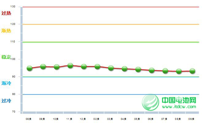 9月份中轻景气指数为93.25,比上月上涨0.14,位于“稳定”区域(参见下图)。