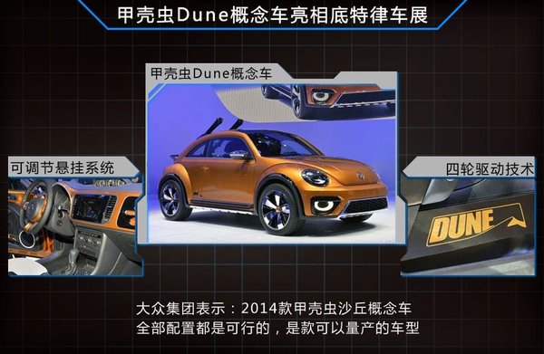 大众在底特律车展亮相了甲壳虫Dune(沙丘)第二代概念车,新车除外观更越野外,对内饰也进行了升级,并标注了“Dune”的醒目标识。新车还采用了可 调节式悬挂系统,以应对各种路面情况。动力方面,新车将会搭载一台最大功率为155KW的2.0L涡轮增压发动机,与之匹配的是DSG六挡双离合变速箱, 其有望在2015年推出量产版本。