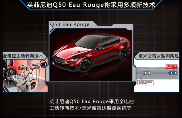 英菲尼迪Q50 Eau Rouge搭载了全电控主动转向技术、毫米波雷达监测系统等多项驾驶辅助系统。英菲尼迪全球执行设计总监阿方索先生表示:“性能是英菲尼迪基因中的重要支 柱,Q50 Eau Rouge在设计上表达了对这一理念更加深入的诠释。另外,英菲尼迪Q50汇聚了大量科技,为高性能版本提供了绝佳的基础。”此外,新车还采用了全新 Infiniti InTouchTM人机交互系统,并应用首创的双触屏设计并支持多点触控,将传统的信息显示和功能操作两大功能区分开,实现更为可靠的驾驶。