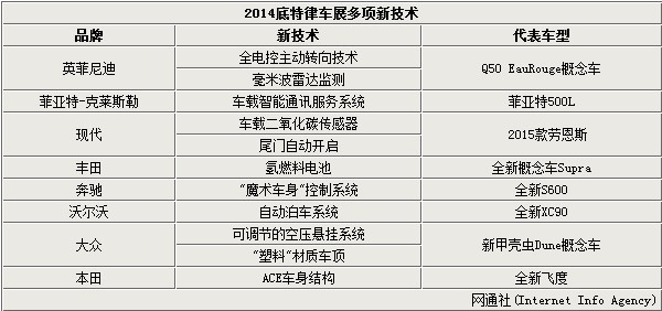 在本届底特律车展上,有50余款新车在车展首发亮相,这也是汽车厂商们利用电子技术进行比拼的一次展示,众多车企带来了最新研发的应用技术,其中包括:英菲尼迪全电控主动转向技术、沃尔沃自动泊车系统等,未来这些技术均有望应用在各自旗下车型中。网通社为您盘点了8家车企应用全新科技的车型,其中6项科技未来将有望引入国内销售。