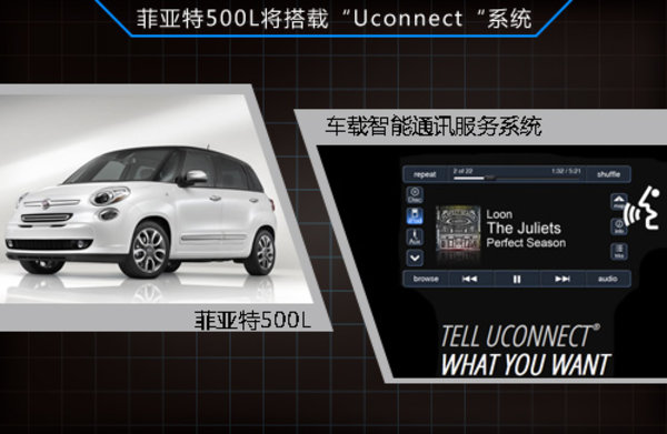 菲亚特-克莱斯勒全新的车载智能通讯服务系统,也称为“Uconnect”。这套系统在2013年美国CES消费类电子展上也曾出现,Uconnect娱乐信息系统能支持收音机、多媒体、导航、电话和App,甚至连座椅加热和空调恒温都可以通过这个系统来调节。此外,2014款菲亚特500L等车型均有望采用,消费者在购买时候可选装Uconnect娱乐信息系统,安装成功就可以激活这些功能。