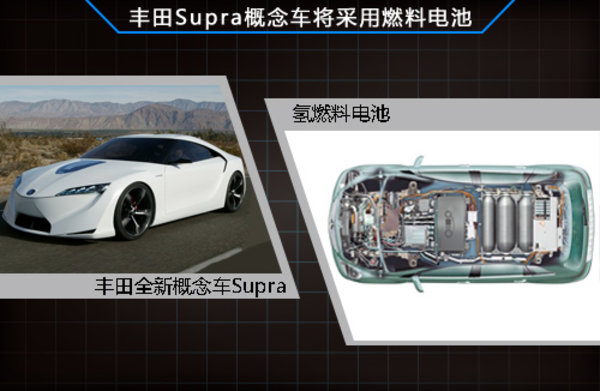 丰田全新Supra概念车则应用其最新研发的氢燃料电池,这是丰田和宝马在燃料电池、轻量化技术和锂离子电池等领域展开合作的首款搭载车型。该车可能会配 备一个高性能的混合动力系统,相对于丰田之前开发的氢动力汽车Highlander FCV-adv,新燃料电池组的体积小了三分之一,能量密度却是FCV-adv所用电池组的两倍。此外丰田Supra概念车还将应用大量轻量化的碳纤材质。