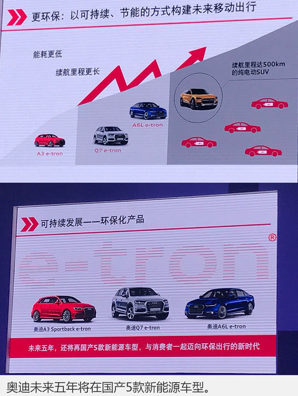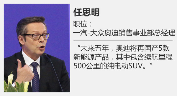 一汽-大众奥迪品牌新闻年会于2月17日在北京举办,一汽-大众奥迪销售事业部总经理任思明先生在会上提到:“未来五年,奥迪还将再国产5款新能源车型,其中包含续航里程500公里的纯电动SUV。” 网通社对一汽-大众奥迪近期的新车消息进行梳理后发现,除上述提到的纯电动SUV之外,五款新能源车型还有望包含Q5、A3、A4及Q2的插电混动版。