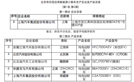 北京市经济信息化委汽车与交通设备产业处已经公布了第一批一共七款纯电动车。分2期公布的,2月26日为第一期,有北汽E150ev和比亚迪E6 ,第二批有另外五款车型,分别是江淮 和悦iEV、北汽 C70GB、比亚迪 腾势、华晨宝马 之诺(ZINORO1E)、荣威 E50 。