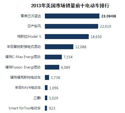 我们再看看世界汽车强国的美国市场,其2013年销量前十电动车依次是通用汽车雪佛兰沃蓝达、日产聆风、特斯拉Model S、丰田普锐斯插电式混合动力车、福特C-Max Energi混合动力车、福特Fusion Energi混合动力车、福特福克斯纯电动车、丰田RAV4电动车、三菱i和Smart forTwo电动车。其中,前六车型销量均在6000辆以上,前三销量更是均超我国新能源汽车总量,特斯拉销量1.87万辆。