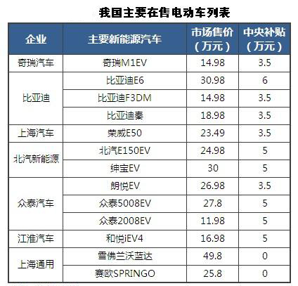 如今,进入工信部新能源车目录的国产车约十几款,品牌涉及到奇瑞、比亚迪、北汽、 上汽、启辰、雪佛兰等。另外,从目前有公布销量数据看,奇瑞M1 EV、比亚迪F3DM和E6、北汽E150EV、绅宝EV、众泰朗悦EV、雪佛兰沃蓝达以及赛欧电动等,这些车型在去年的销量均不超2000辆,其中,比亚迪 EE6、F3DM销量相对较多,分别为1544辆和1005辆。