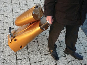 电动自行车由于有笨重的电池而令整车重量比较大,往往不便于携带。Moveo也较重,整车有25公斤。但是,它折叠后可以像拉杆箱那样拖动,就十分方便人们随身携带了。有了这样的功能,人们可以把它随意地带上火车、地铁,轻松地通过电梯带入到办公室或住宅内。人们还可以把它装入到汽车后备箱,在抵达郊游目的地时启用Moveo,可以达到汽车不能达到的区域,进行灵活自如的“慢游”。