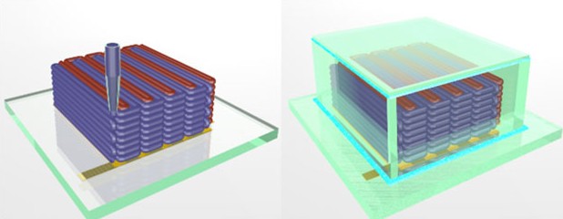 电池的制造工艺非常精细,纳米颗粒糊状物从喷嘴喷出,形成 1 毫米宽的梳状沉积层。第二个梳状沉积层依偎第一个沉积层,牙齿互锁——作为导电的两极。打印后的电极层会迅速硬化,并放置在一个特殊的小箱内。