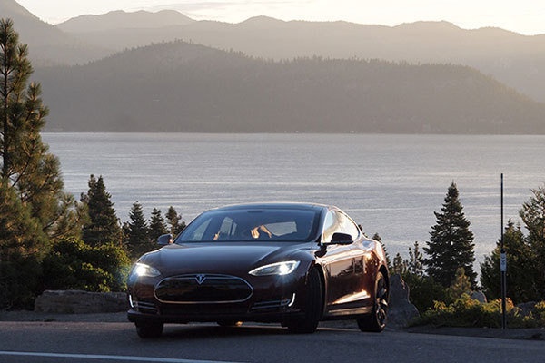 7.刚刚在特斯拉充电桩完成充电的汽车在加州附近的太浩湖即将开始530英里的旅程。
