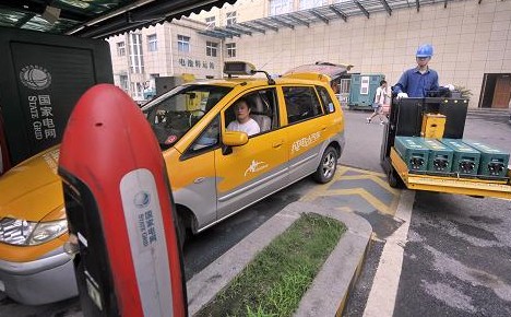 一辆电动出租车在位于杭州古翠电动汽车充换电站进行能源电池快速更换。浙江省杭州市作为我国新能源汽车示范推广及私人购买新能源汽车补贴“双试点”城市,已形成以充换电站为主,交流充电桩为补充,全方位、立体化、信息化的智能充换电服务网络,有效促进了杭州新能源汽车产业的发展。目前,国家电网杭州供电公司已建设62座充换电站和配送站、5座充电站、620个交流充电桩,杭州城区平均每2座充换电站和配送站的服务间距约4.5公里,城区15分钟充换电服务圈初步形成,并实现了充换电站在杭州范围的全覆盖。截至8月底,杭州电动汽车智能充换电服务网络管理纯电动汽车370辆,其中包括新能源出租车210辆,累计提供换电服务43万车次,车辆总行驶里程达2470万千米,按每辆车每年减排38吨算,已为杭州减少2万吨碳排放。杭州市今年11月底之前计划实现运营500辆电动出租车。