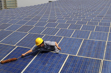 一名工人正在清洁房顶上的太阳能板。天台太阳能板的铺设增加了消防救援的难度。(路透社)