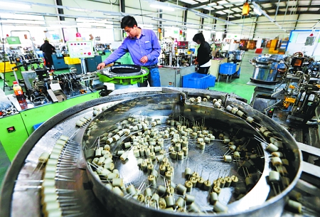 8月2日,淮滨县鑫展电子有限公司员工正在生产铝电解电容器。该企业从深圳转移到该县产业集聚区,已形成了年产7亿只铝电解电容器的生产规模。记者 王天定 摄
