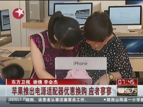 不久前,一位空姐怀疑使用山寨充电器给苹果手机充电,导致触电身亡。9日,苹果公司宣布在中国地区启动USB电源适配器回收计划。顾客可以把自己的电源适配器拿到苹果店,用68元的特价换购一个正版充电器。然而,换购启动第一天,消费者反映平平。