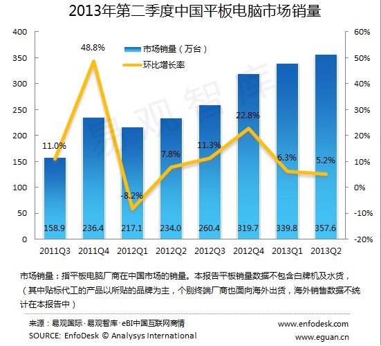 2013年二季度中国平板电脑市场销量为357.6万台,同比增长5.2%。