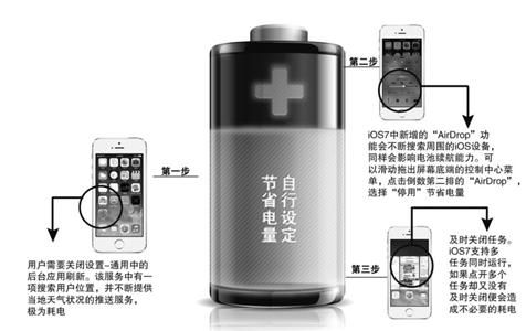 首先,用户需要关闭设置-通用中的后台应用刷新。该服务中有一项搜索用户位置,并不断提供当地天气状况的推送服务,极为耗电。其次, iOS7中苹果新增的“Air-Drop”功能也会不断搜索周围的iOS 设备,同样会影响电池续航能力。用户可以滑动拖出屏幕底端的控制中心菜单,点击倒数第二排的“AirDrop”,选择“停用”即可节省电量。