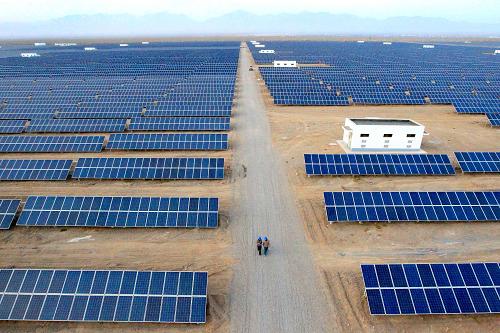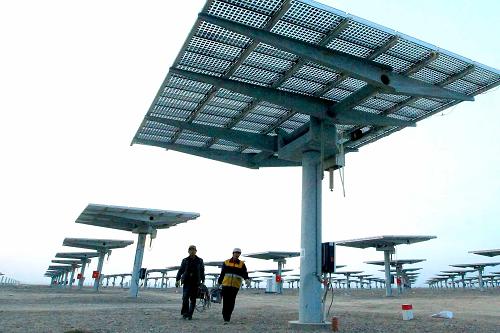 2013年10月24日,技术人员从新疆哈密石成子光伏园区的太阳能电池板旁走过。新疆哈密风电、光电资源丰富,截至目前,新疆哈密获得核准风电项目55个,总规模426.9万千瓦,现已有22个风电项目并网发电,容量达126.9万千瓦;获得核准光伏项目31个,总规模66万千瓦,现已有11个光伏发电站并网发电,容量达21.5万千瓦。