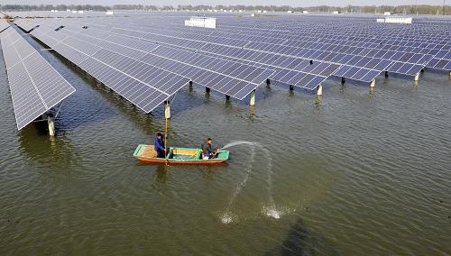 10月24日,工作人员在江苏盐城市建湖县境内的“渔光互补”光伏发电站清洁水体。建湖县从2011年开始分期建设“渔光互补”光伏发电站,在水面上方架设光伏组件发电,利用水体进行水产养殖,提高了水面资源利用效率。新华社发(濮良平 摄)
