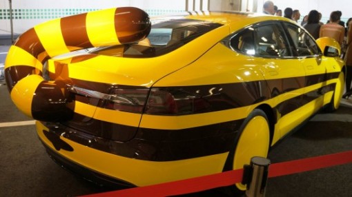 这台特斯拉Model S拥有黄色为主色调的车身,黑色条纹,栩栩如生的耳朵、眼睛、胡须、上翘的嘴角和蜷曲的尾巴,俨然是一只憨态可掬的小老虎。而站在这台老虎”特斯拉Model S旁边的正是有“铃木怪兽山道王”之称的田嶋伸博。