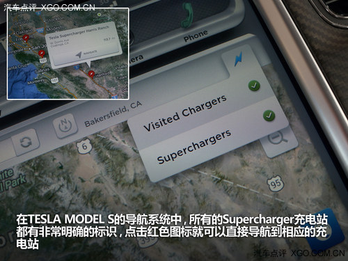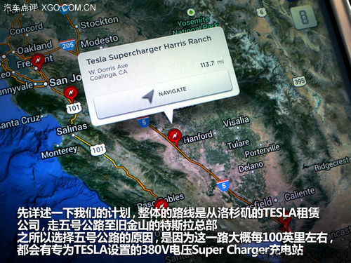 由于TESLA沿着西海岸建立了足够多的充电站,这也是我们接下来敢从洛杉矶长途奔袭600余公里去旧金山的理论基础。在TESLA MODEL S的导航系统中,所有的Supercharger充电站都有非常明确的标识,点击红色图标就可以直接导航到相应的充电站。
