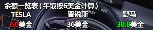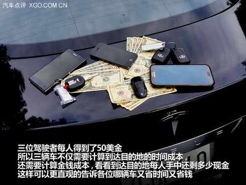 从租赁公司搞定了TESLA之后,顺便把野马和普锐斯补满了87#汽油,三辆车聚齐后我们加入了一个小环节:给三位驾驶者每人派发50美金。所以三辆车不仅需要计算到达目的地的时间成本,还需要计算金钱成本,看看到达目的地每人手中还剩多少现金,这样可以更直观的告诉各位哪辆车又省时间又省钱。