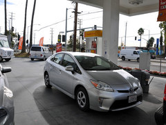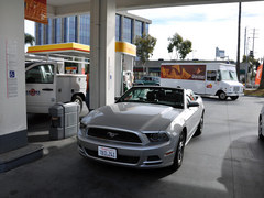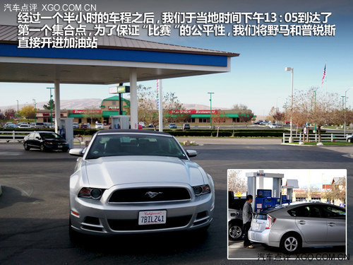 经过一个半小时的车程之后,我们于当地时间下午13:05到达了第一个集合点,为了保证“比赛“的公平性,我们将野马和普锐斯直接开进加油站,最终第一轮比赛的成绩想必大家已经猜到结果,普锐斯消耗燃油2.073加仑(约为7.9升),花费8美金,而野马则以3.420加仑(约为13升)的燃油消耗,和13.2美金的花费落败,TESLA虽然没有任何花费,但是消耗了将近一半的里程,剩余159英里(约为256公里),较为保守的我们不得不将其送入充电站。