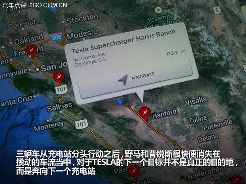 三辆车从充电站分头行动之后,野马和普锐斯很快便消失在攒动的车流当中,对于TESLA的下一个目标并不是真正的目的地,而是奔向下一个充电站。