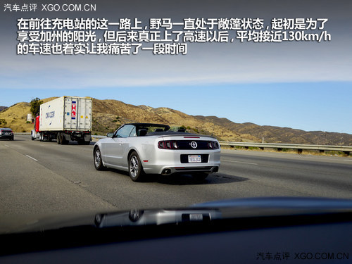 在前往充电站的这一路上,野马一直处于敞篷状态,起初是为了享受加州的阳光,但后来真正上了高速以后,平均接近130km/h的车速也着实让我痛苦了一段时间,脸被吹的冰冷,头皮甚至都有些发麻,虽然暖风一直保持在高档位,但好像也没什么太多的效果,像我这种没有开过敞篷车的屌丝现在终于明白“空气围脖”究竟有何用途了,不过已然这样了不如将计就计好了,在保证安全的情况下,直接将相机伸出车外拍照。
