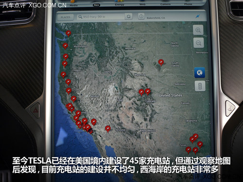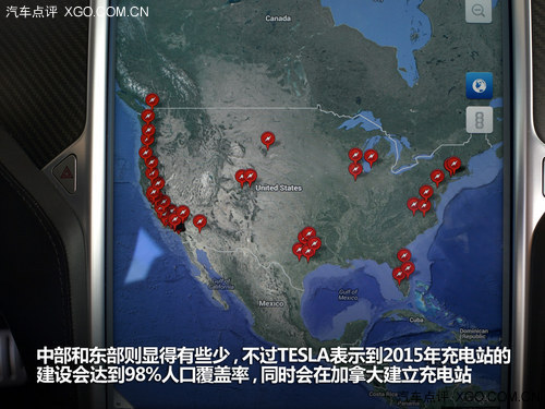 在美国,TESLA的高压充电站是解决充电的一大法宝,至今TESLA已经在美国境内建设了45家充电站,但通过观察地图后发现,目前充电站的建设并不均匀,西海岸的充电站非常多,中部和东部则显得有些少,不过TESLA表示到2015年充电站的建设会达到98%人口覆盖率,同时会在加拿大建立充电站。