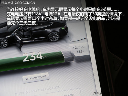 当连接好充电线后,车内显示屏显示每个小时只能充3英里……充电电压只有118V,电流12A,在电量仅消耗了30英里的情况下,车辆显示需要11个小时充满,如果是一辆完全没电的车,岂不是要充个三天三夜……