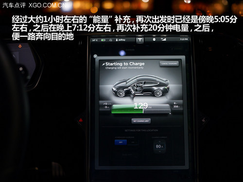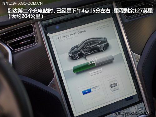 到达第二个充电站时,已经是下午4点15分左右,里程剩余127英里(大约204公里),经过大约1小时左右的“能量”补充,再次出发时已经是傍晚5:05分左右,之后在晚上7:12分左右,再次补充20分钟电量,之后,便一路奔向目的地。