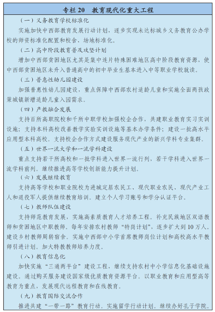 完善现代职业教育体系,加强职业教育基础能力建设。推动具备条件的普通本科高校向应用型转变。推行产教融合、校企合作的应用型人才和技术技能人才培养模式,促进职业学校教师和企业技术人才双向交流。推动专业设置、课程内容、教学方式与生产实践对接。促进职业教育与普通教育双向互认、纵向流动。逐步分类推进中等职业教育免除学杂费,实行国家基本职业培训包制度。