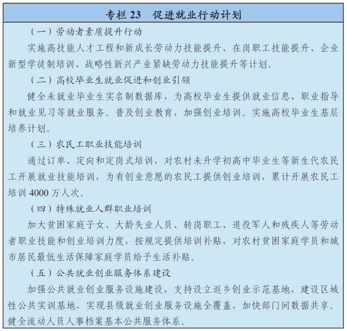 坚持计划生育的基本国策,全面实施一对夫妇可生育两个孩子政策。改革完善计划生育服务管理,完善生育登记服务制度。提高生殖健康、妇幼保健、托幼等公共服务水平。做好相关经济社会政策与全面两孩政策的有效衔接。完善农村计划生育家庭奖励扶助和特别扶助制度,加强对失独家庭的关爱和帮助。做好优生优育的全程服务。注重家庭发展。综合治理出生人口性别比偏高问题。全国总人口14.2亿人左右。