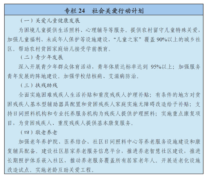 建立以居家为基础、社区为依托、机构为补充的多层次养老服务体系。统筹规划建设公益性养老服务设施,支持面向失能老年人的老年养护院、社区日间照料中心等设施建设。全面建立针对经济困难高龄、失能老年人的补贴制度。加强老龄科学研究。实施养老护理人员培训计划,加强专业化养老服务护理人员和管理人才队伍建设。推动医疗卫生和养老服务相结合。完善与老龄化相适应的福利慈善体系。推进老年宜居环境建设。全面放开养老服务市场,通过购买服务、股权合作等方式支持各类市场主体增加养老服务和产品供给。加强老年人权益保护,弘扬敬老、养老、助老社会风尚。